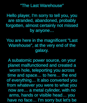 You are here in the "Magnificent Lost Warehouse", at the very end of the galaxy. A subatomic power source, on your planet malfunctioned and created a worm hole, which teleported you across time and space… to here… the end of everything… It also converted you from whatever you were to what you now are… a metal cylinder, with no arms, hands or visible head… you have no face… I'm sorry but let's be honest, your face left a lot to be desired anyway… This is probably for the best…